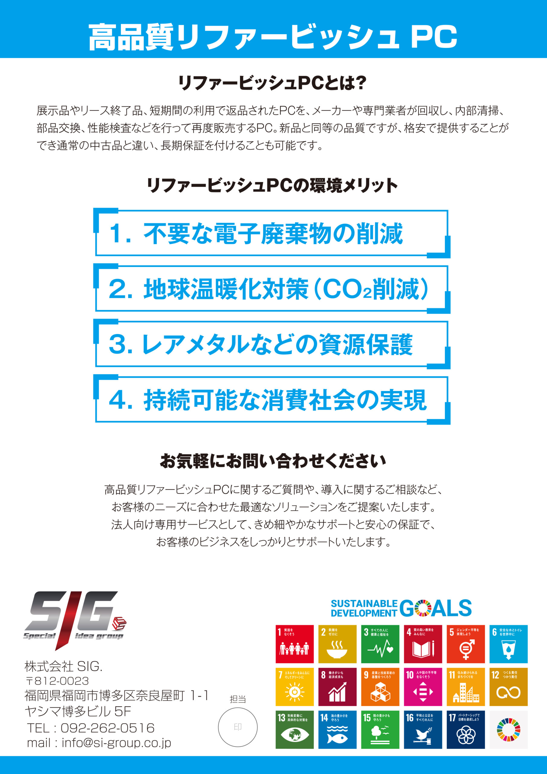炭化水素冷媒ガス及び低熱分解型アップサイクルユニットPISTEC事業 近年、地球温暖化対策の一環として、自然冷媒ガスの導入が求められています。本事業は、フロン類を使用しない「自然冷媒ガス」の普及を促進し、持続可能な社会の実現を目指すものです。本事業は、冷凍・冷蔵、空調設備などにおいて、CO₂やアンモニア、炭化水素などの自然冷媒を導入を支援し、フロン排出抑制や省エネルギー化を図ることを目的としています。これにより、温室効果ガスの削減と環境負荷の低減を実現します。 冷媒ガスの詳細はこちら PISTECの詳細はこちら デジタルサイネージ・LED機器事業 近年、情報発信のデジタル化と省エネルギー化が求められる中、デジタルサイネージ(電子看板)やLED照明の導入が急速に進んでいます。本事業は、最新のデジタルサイネージおよびLED機器の普及を促進し、効率的かつ環境に優しい情報発信・照明環境の実現を目指します。 詳しくはこちら 動画制作・企画事業 デジタルコンテンツの需要が高まる中、企業や団体が効果的に情報を伝える手段として動画の活用が急速に進んでいます。本事業は、高品質な動画コンテンツの企画・制作を支援し、企業のブランディングやプロモーション、情報発信の最適化を目指します。 詳しくはこちら 詳しくはこちら リファービッシュPC販売事業 環境にもやさしい「リファービッシュ(再生)パソコン」の取扱いを開始いたしました。 メーカーにより動作確認・整備が行われた高品質なリファービッシュ(再生)パソコンを、安心の保証付きでご提供いたします。 詳しくはこちら